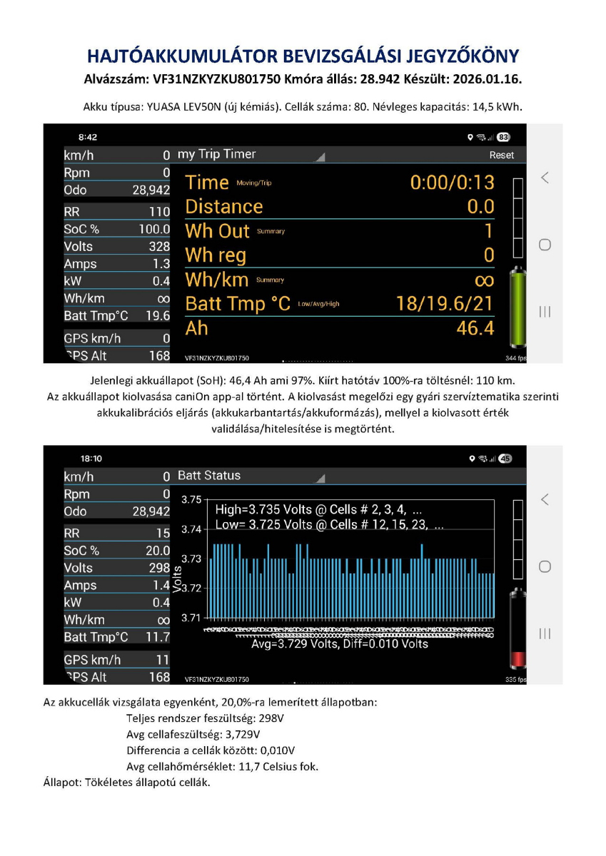 Bevizsgált autó, 14,5 kWh-s akkuval szerelve, akár 130 km maximális hatótáv (akkubemérési jegyzőkönyv a képek között). Otthoni normál 230V konnektorról töltve bő 1 liter üzemanyag árából elmegy 100 km-t ez a 2019.10. havi 28.942 km-t futott autó, melyen a gyári szerviztematika által ajánlott akkukarbantartás is el lett végezve (100.000 Ft) valamint egy teljes nagyszervíz (100.000 Ft).